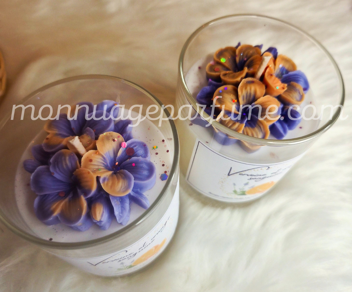 Disponible en 150gr (avec fleurs) ou 290gr (avec orange).